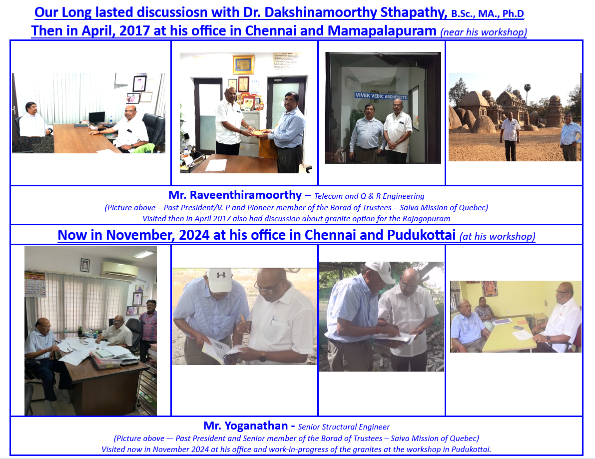 Chairperson of the Board of Trustees (BOT) Mr. Umapathy – Member of the four-member group for “Granite” Rajagopuram restoration Project and Past President, had visited Dr. Dakshinamoorthy Sthapathy, B.Sc., MA., Ph.D. at his office in Chennai and later at his workshop in Mahabalipuram and Pudukkottai – India.. Click here for more pictures of his visit.